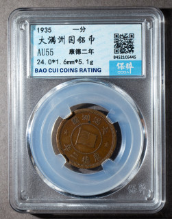 康德二年伪满洲国壹分硬币一枚(保粹CCGA AU55)