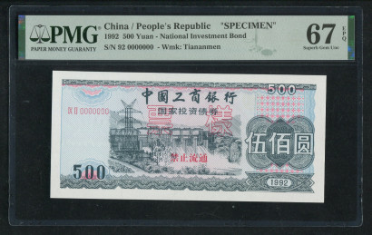1992年中国工商银行国家投资债券伍佰圆票样(PMG 67EPQ)