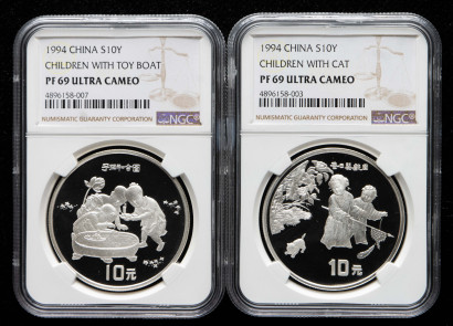 1994年中国古代名画婴戏图-子孙和合图、冬日婴戏图1盎司精制银币各一枚,共二枚(NGC PF69)