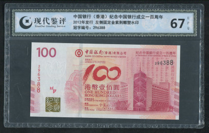 2012年纪念中国银行成立一百周年港币壹佰圆(现代鉴评 67EPQ、296388)