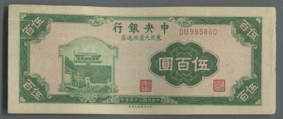民国三十五年中央银行东北九省流通券伍百圆(DU995860、折白、金马王)