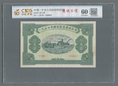 1954年国家经济建设公债拾萬圆(中乾CMG 60EPQ、ⅠⅡⅢ8368010)