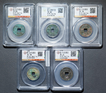 金-大定通宝2枚、正隆元宝、明-永乐通宝、宋-太平通宝各1枚,共5枚(公博GBCA 美85、美82、美78、真品)