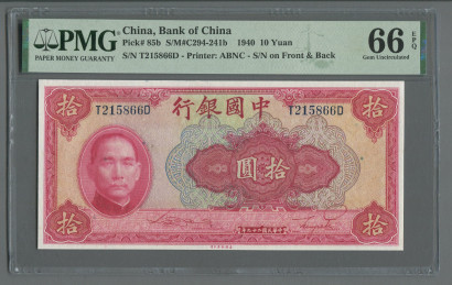 民国二十九年中国银行拾圆(PMG 66EPQ、T215866D)