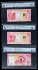 2013年中国银行澳门币拾圆、2016年大西洋银行丙申猴年、2017年大西洋银行丁酉鸡年生肖纪念钞澳门币拾圆各一枚,共三枚(现代鉴评 68EPQ)